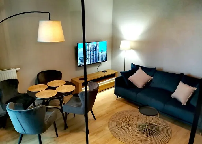 Τα δωμάτια προσφέρουν παροχές κουζίνας, συμπεριλαμβάνοντας ηλεκτρικό βραστήρα, ψυγείο και φούρνο. Απέχει λιγότερο από 5 λεπτά με τα πόδια από την στάση λεωφορείων Szafarnia.